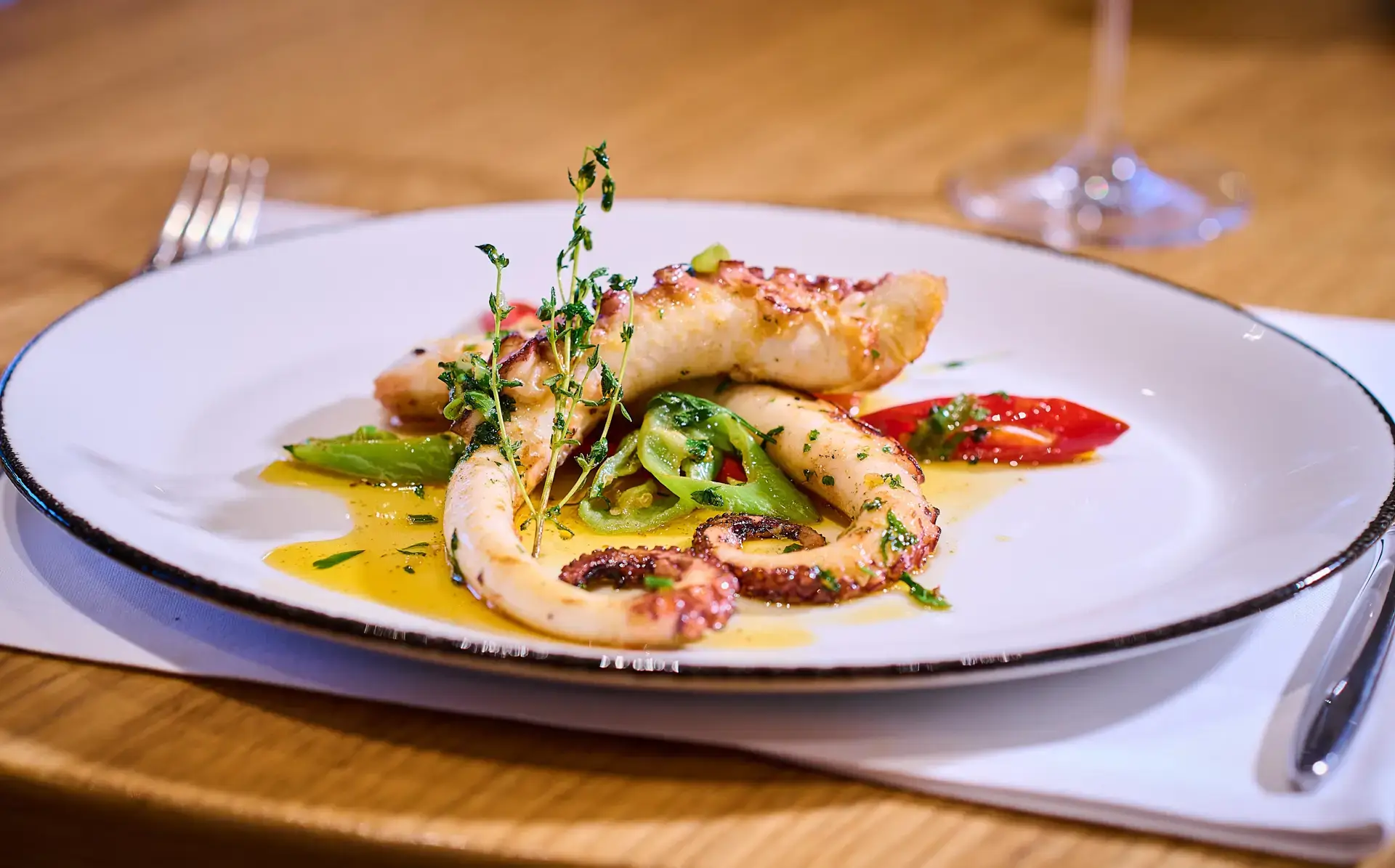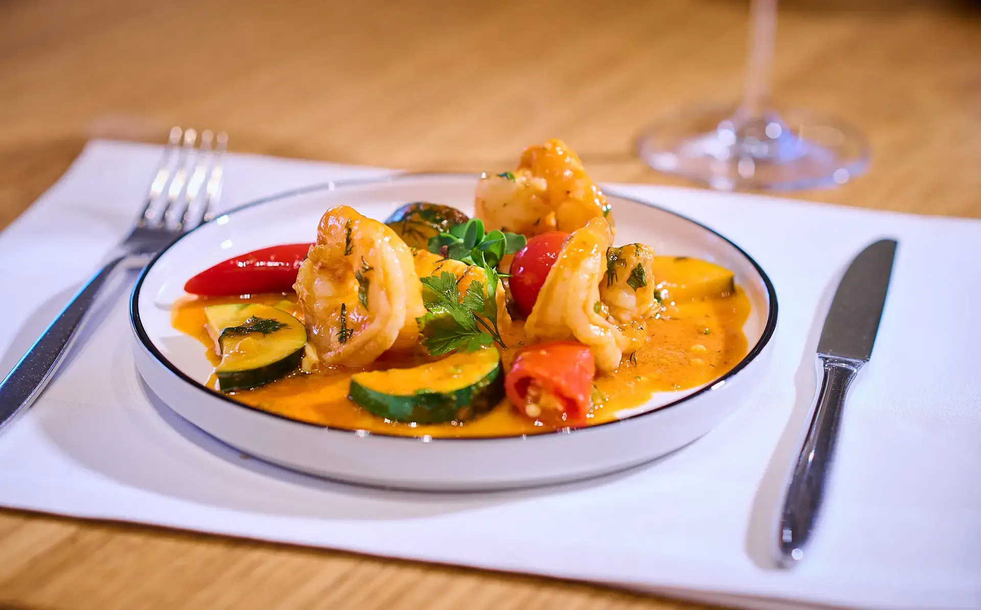 Hier verbindet sich der industrielle Charme des Raums mit moderner Eleganz und dem kulinarischen Können des Tablo.