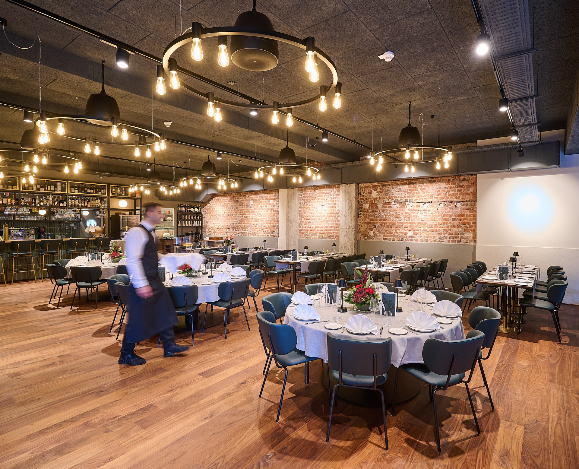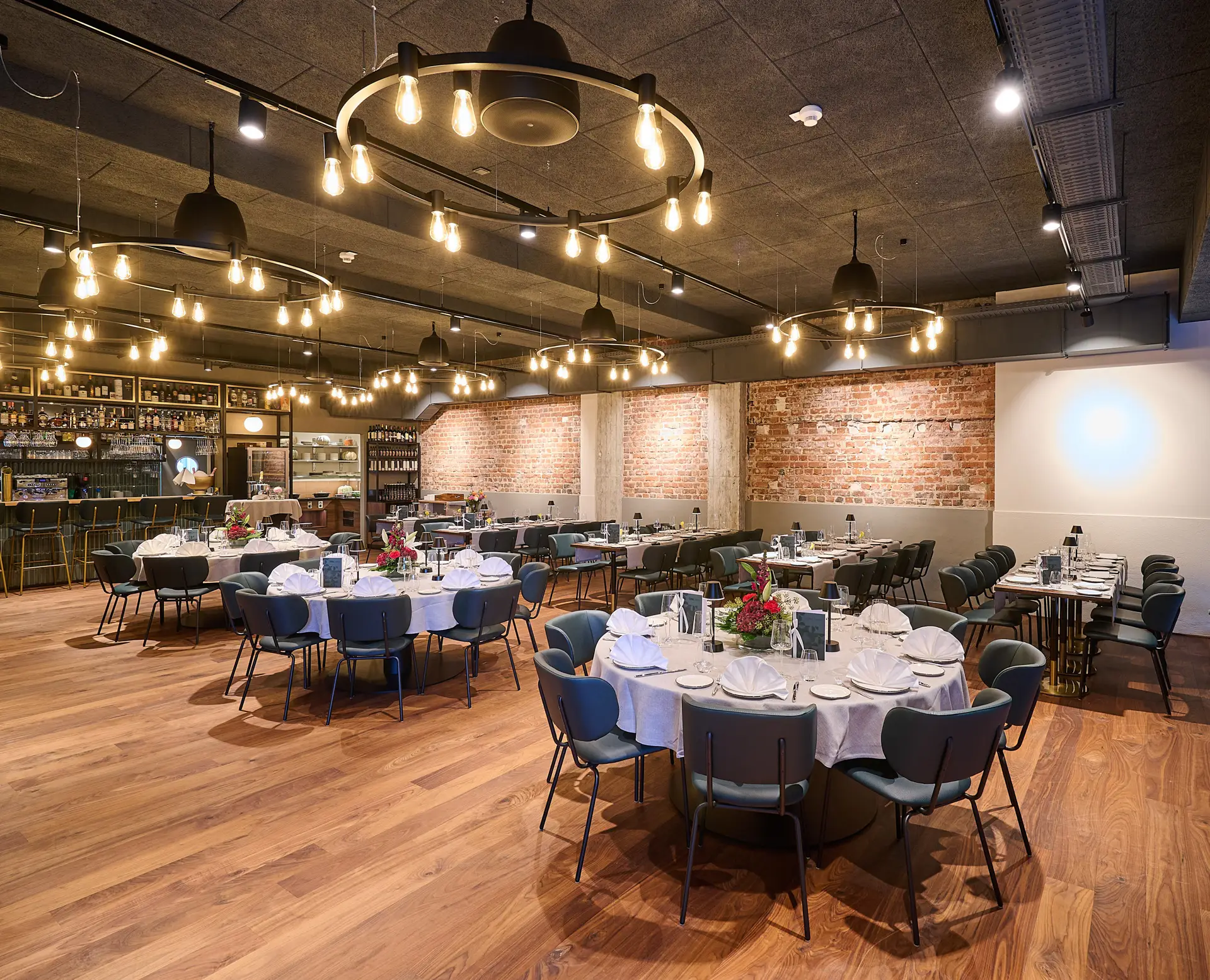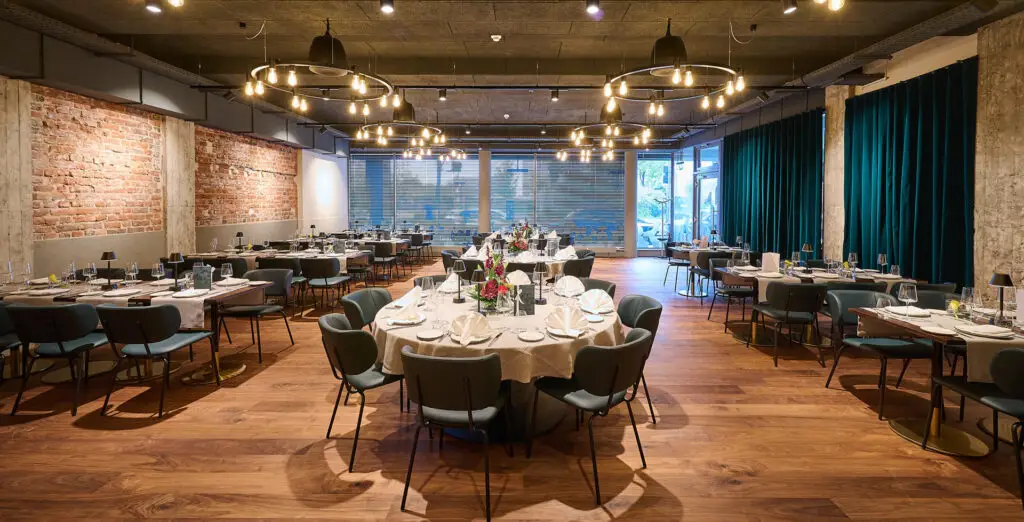 Offenes Backsteinmauerwerk, Holz, Glas und warmes Licht schaffen ein Ambiente, das sowohl kraftvoll als auch einladend wirkt. Die Raumgestaltung erlaubt flexible Setups – vom festlichen Dinner bis zur lebendigen Party.